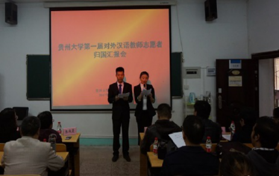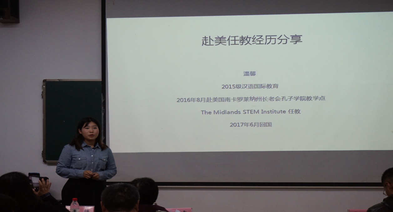 2016年,新蒲京官网2015级汉语国际教育专业的同学们分赴美国、泰国、柬埔寨、保加利亚等国做汉语教师志愿者。在此次汇报会上,他们从海外汉语教学现状、教学活动、教学经验和感悟等方面进行了分享。从各国结束汉办教师志愿者工作归来的同学,不仅分享了实用有趣的教学方法,同时表示每一位汉语教师志愿者不仅是中国文化的传播者,更是外国认识中国的纽带,志愿者的一言一行都代表着中国形象。总结了从事汉语教师志愿者最重要的两点:一是敬业,在海外教学中,时刻铭记推广汉语教学、传播中华文化的任务。二是善于与学生沟通,不断反思,提升教学技能。