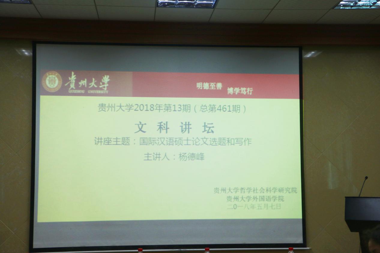 新蒲京娱乐场官网3245研究生科讯 2018年5月7日上午10:00,北京大学对外汉语教育学院博士生导师,学术委员会主任,汉语与应用研究室主任杨德峰教授在新蒲京官网201报告厅作题为“国际汉语硕士论文选题和写作”的学术讲座。讲座由新蒲京娱乐场官网3245副院长宁梅教授主持。来自贵州医科大学、贵州财经大学、贵阳学院、铜仁学院、新蒲京娱乐场官网3245国际教育学院、新蒲京娱乐场官网3245的老师和研究生逾百人参加了讲座。