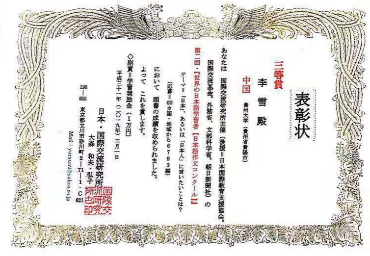 新蒲京娱乐场官网3245研究生会宣传部讯 3月1日,新蒲京官网2017级日语笔译研究生李雪在日本国际交流研究所主办的“第二届世界的日语学习者日语作文大赛”中荣获三等奖。