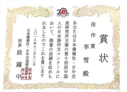 面对获奖,李雪同学表示:特别感谢我校日籍教师须崎孝子老师对自己的悉心指导以及王晓梅老师给予的支持和鼓励。