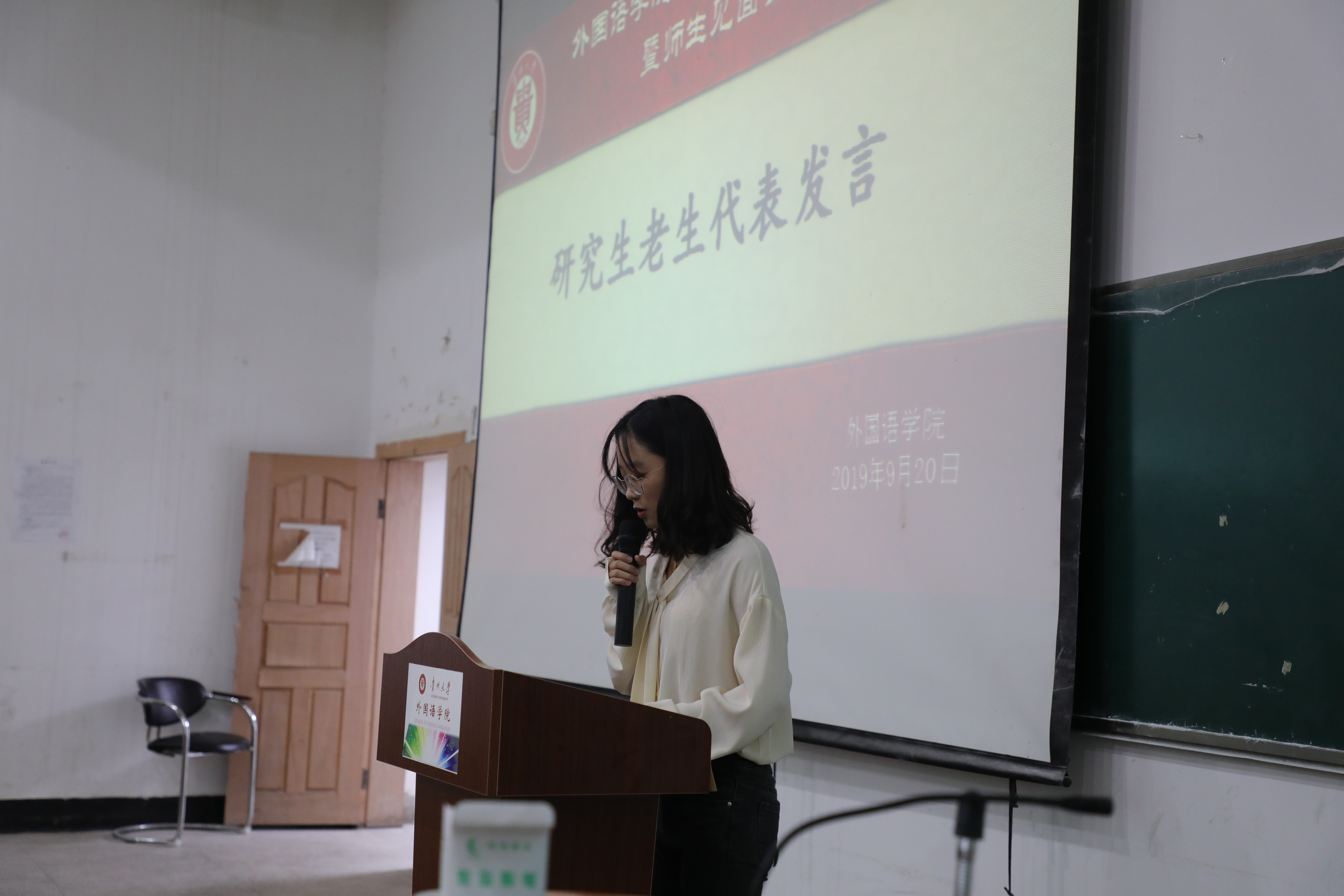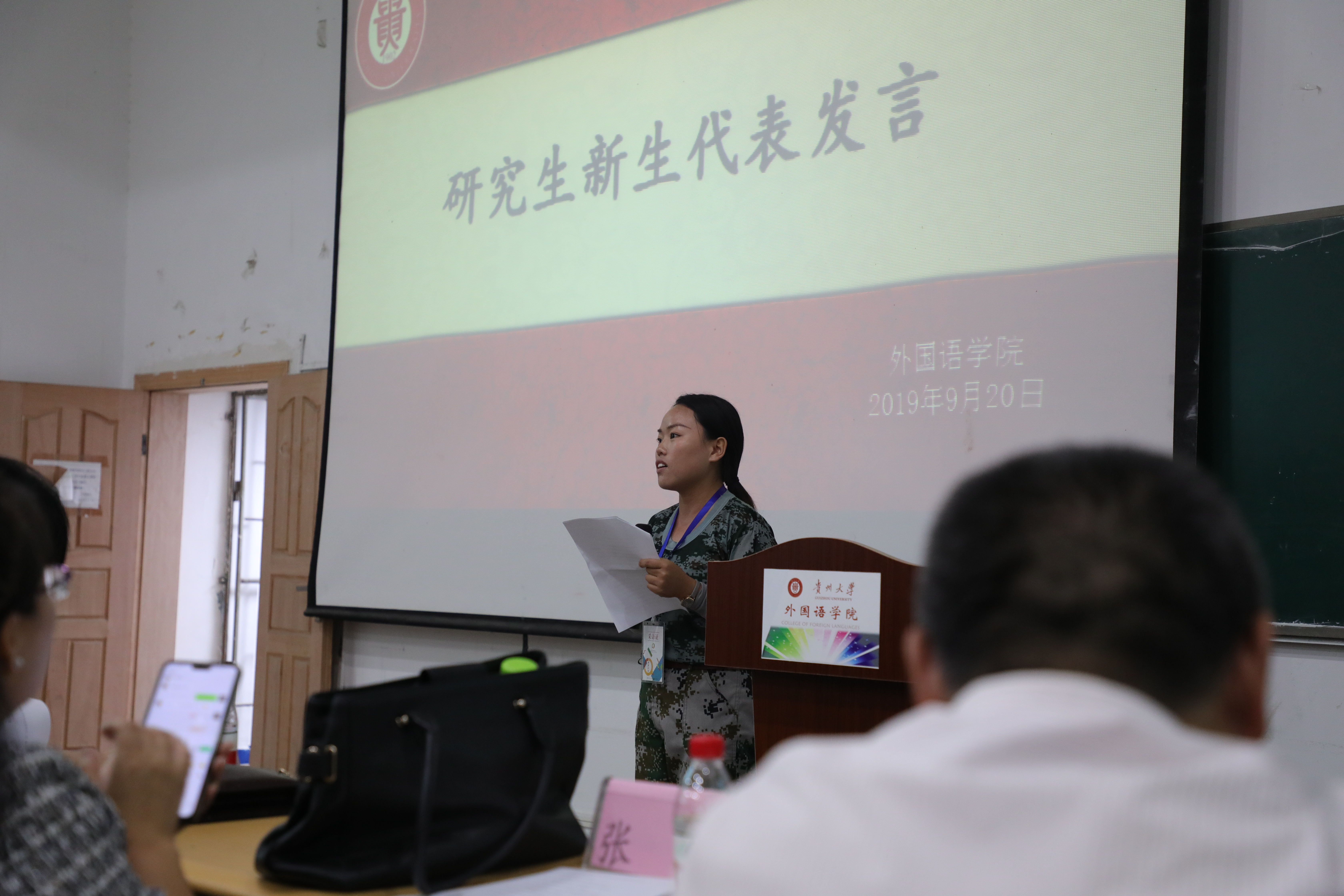 接着2017级研究生老生代表沈韵提醒大家除了要在学习、工作和生活方面合理安排,还要学会广泛阅读并持之以恒;然后2019级新生代表石英提起其在贵大外院的五年里对于支教事业的热爱与坚持,祝愿各位同学未来几年也能在外院、在贵大找到自己的别样明天;作为研究生会主席、2017级外国语言学及应用语言学的董书敏对院研究生会进行了简介,并为大家送上了“不忘初心,满怀信心,做个根正苗红的贵大人”的别样祝福。
