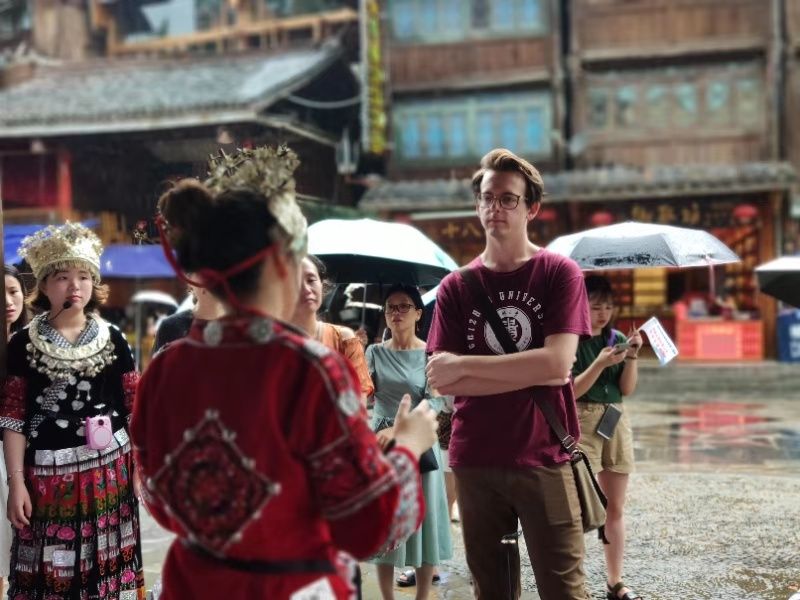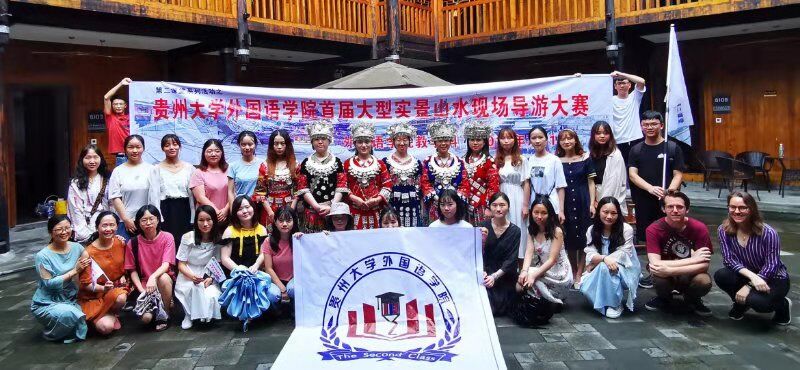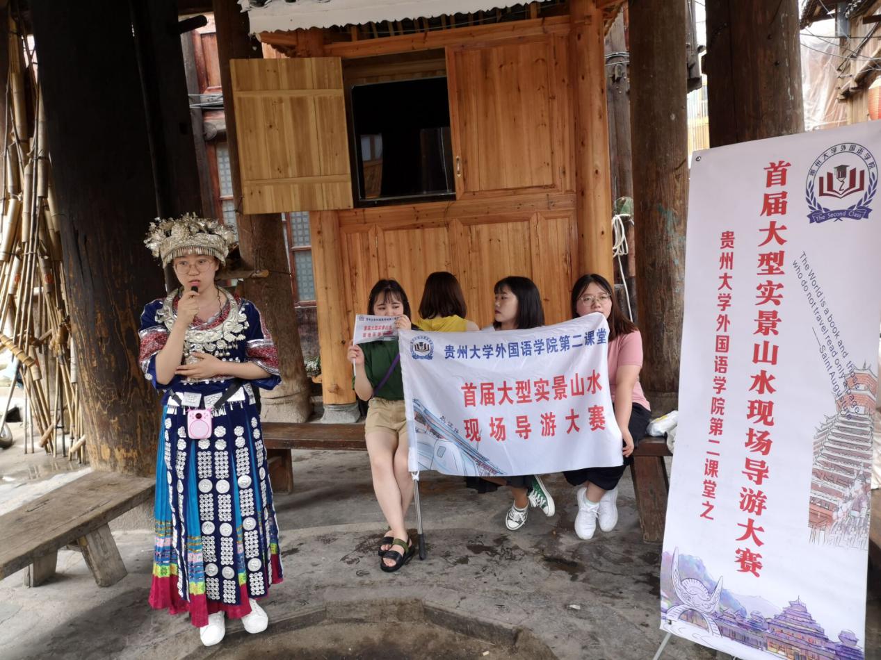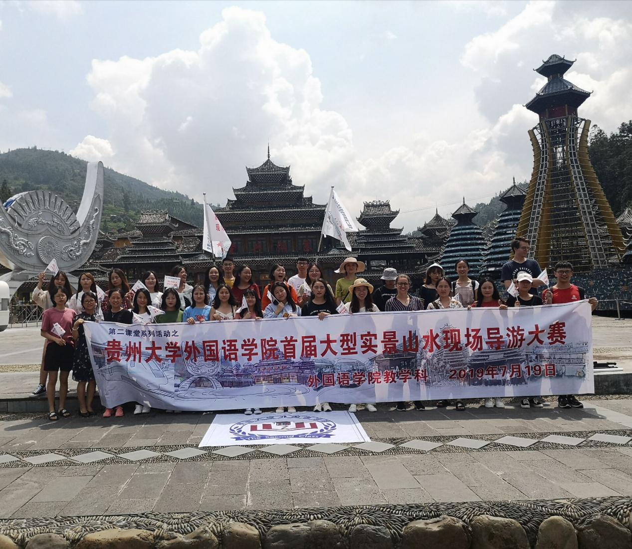 新蒲京娱乐场官网3245教学科讯 2019年7月19日,新蒲京娱乐场官网3245第二课堂首届大型实景山水现场导游大赛在肇兴侗寨拉开帷幕。外教Austin老师,Zoe老师,关志远老师,田婷老师,彭芳坪老师及英语163班全体成员参与此次活动。此次现场导游大赛与以往的模拟导游大赛最大的不同是同学们来到了真实的旅游景点,切身体会真实的导游行业。