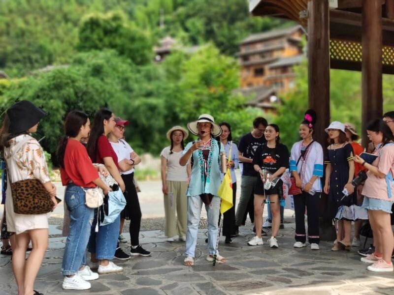 当地导游对肇兴侗寨进行仔细的讲解,为接下来的比赛做好准备。尽管天气炎热也挡不住同学们激动和兴奋的心情。