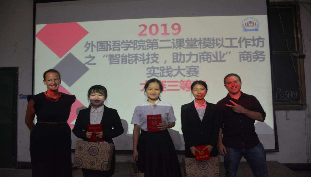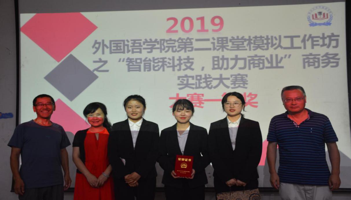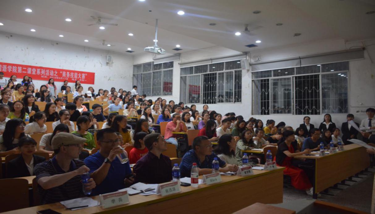 新蒲京娱乐场官网3245教学科讯 为丰富学生课余生活,增强学生技能,新蒲京官网于2019年9月17日星期二晚7点在外阶一举办新蒲京娱乐场官网3245第二课堂模拟工作坊之“智能科技,助力商业”商务技能大赛。本次大赛邀请了新蒲京官网副院长宁梅、英语系主任曾贤模、商务英语系主任陈娟、商务英语系老师高应昶、外教Mark、外教Jessica担任评委。各年级各班共计200人参与了本次比赛。