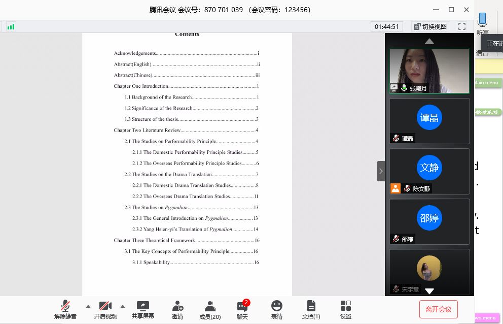 新蒲京娱乐场官网3245教学科讯 2020年5月8日,新蒲京娱乐场官网32452016级本科生毕业论文中期答辩在以腾讯会议的方式举行。此次论文远程中期答辩共分为20个答辩小组,毕业论文指导老师、2016级本科生及教学科工作人员共同参与了答辩。