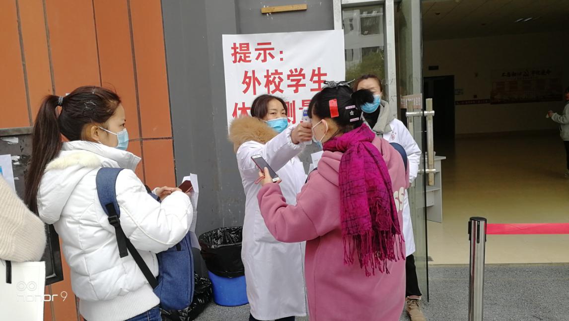 外校考生进入考场前测量体温,准考证上盖蓝章