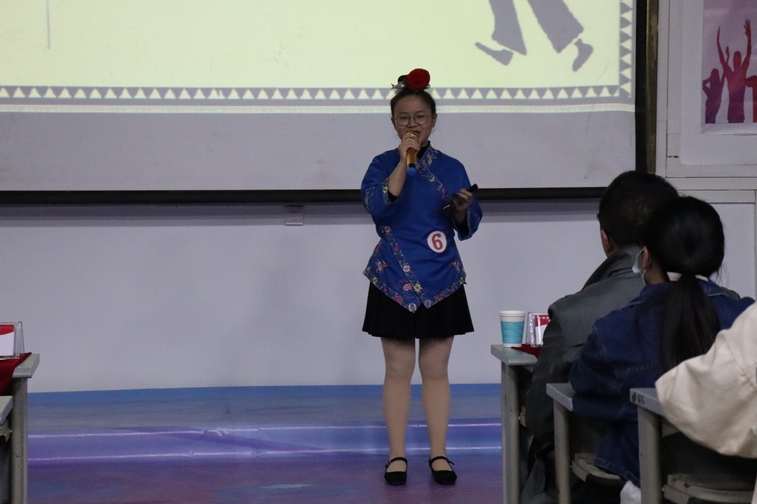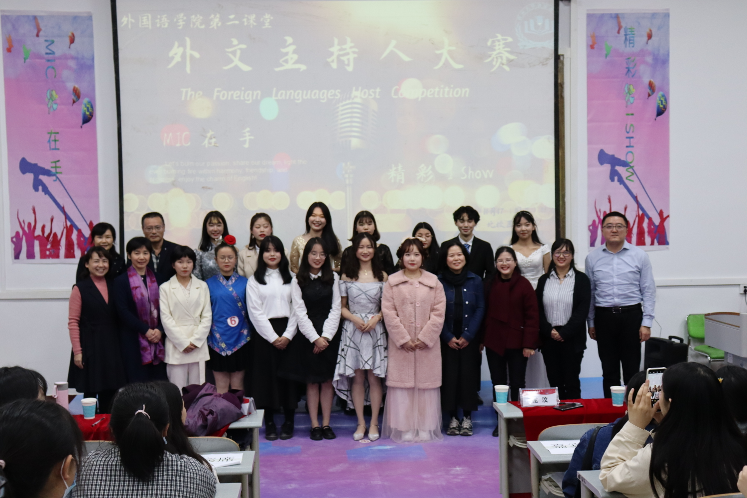 决赛的13人是经过初赛的层层选拔,从近100名参赛者中脱颖而出。晚七点,激动人心的大赛随着一支优雅柔情的民族舞拉开序幕,主持人幽默风趣的介绍,使得活动以轻松愉悦的方式开始进行。比赛刚刚开始,所有观众的眼球就被紧紧抓住,多才多艺的参赛选手凭借过硬的实力赢得了雷鸣般的掌声。观众与主持人热情互动,鼓舞了每一位上台的选手,中场环节出现的两位美女助唱让全场的氛围再次出现高潮,比赛愈发精彩,参赛者们也被这高昂的氛围感染,精彩的表现频频出现,观众们也不吝送上雷鸣般的掌声。面对评委的问题,参赛者也稳扎稳打,从容不迫地交上完美答卷。值得一提的是,充满异乡风情的苗族姑娘介绍了她们多彩的民俗文化,极具特色的民族服装立刻吸引了所有人的目光,观众眼里无不充满向往与好奇。在最后一位选手惟妙惟肖的配音当中,比赛接近尾声,然而观众的兴致更加高昂,依依不舍之中开始等待比赛结果。九点,活动圆满成功,院领导和老师们为获奖选手颁奖并合影留念。
