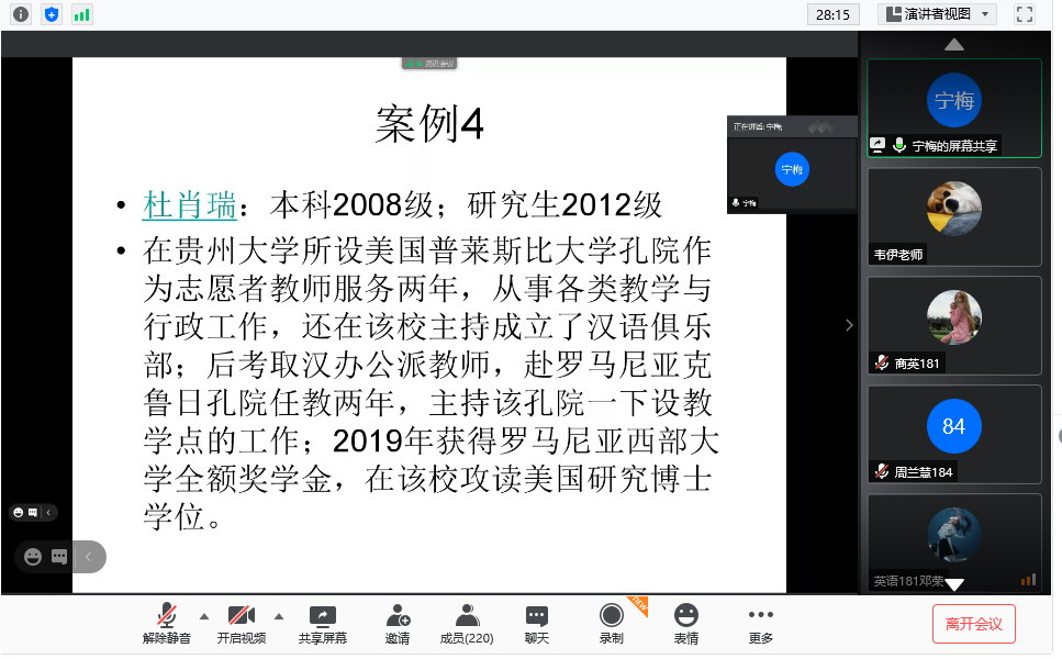 接着,周杰院长从三个方面指导学生学业发展。首先,她强调,一二年级是打基础的阶段,三年是专业学习的关键时期,同学们要做到端正态度,认真阅读,努力完成相应学习任务。其次,同学们已经处于大三的学习阶段,必须要思考、且尽早确定今后的发展方向,定下目标:毕业后是就业还是升学?如果是升学,是国内还是国外?最后,她介绍了新蒲京娱乐场官网3245硕士点的基本情况,新蒲京官网现有外国语言文学一级学科硕士点,下设英语语言文学、外国语言学及应用语言学、日语语言文学三个学术型二级学科硕士点;翻译、汉语国际教育两个专业学位硕士点。周院长告诉同学们,新蒲京娱乐场官网3245外国语言文学一级学科点办学历史悠久,人才培养质量高,在贵州省享有很高的声誉。她鼓励大家积极报考新蒲京官网研究生。