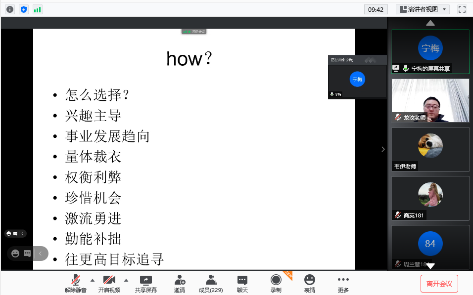 最后,宁院副院长以“Why”、“What”、“How“”、“When”、“Where”作为关键字,给2018级同学做学业发展指导。她首先强调了学院在大家大学学习生涯中关键环节点召开学业发展指导会议的重要意义;其次指出选择正是大家做选择的时间点,要结合自身实际情况尽早做出选择,即继续深造学习还是就业。要为考研做准备,要为今后的事业发展、人生发展做准备。