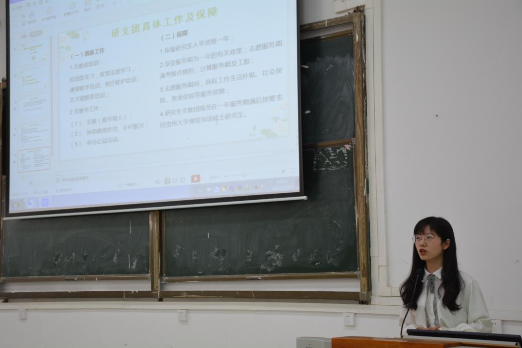 然后,宁梅副院长讲解了毕业生报考我校研究生以及考取本校研究生的各项优惠政策,并详细介绍了我校“博学计划”相关课程的开设情况,鼓励同学们积极选学“博学课程”,并预祝大家取得好的成绩,她还为同学们解答了有关“博学课程”的疑问。