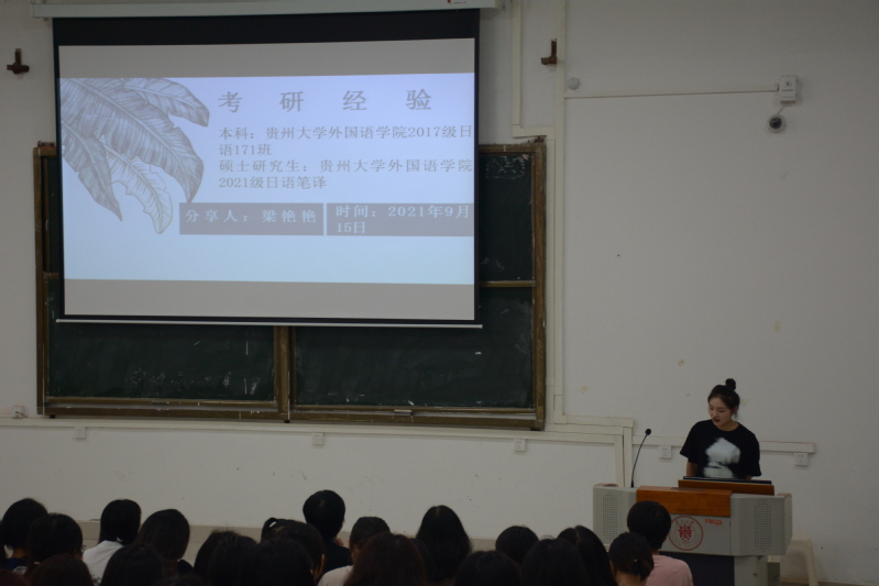 随后,考取新蒲京官网2021级英语语言文学专业硕士的2017级刘丽同学进行了考研分享,着重介绍了自己在备考冲刺阶段的学习心得与心态调整方法,建议同学们重复练习与思维导图结合,注重第二外语的学习。接着,考取新蒲京官网2021级日语专业硕士的2017级杨艳艳同学也与同学们进行了交流分享,指出同学们考研一定要坚定,坚持自己的选择,不要做考研“气氛党”。此外,杨艳艳同学还分享了关于日语考研的方法及博学课程的介绍,对学弟学妹们考研给予了美好的祝愿。