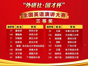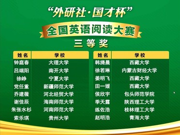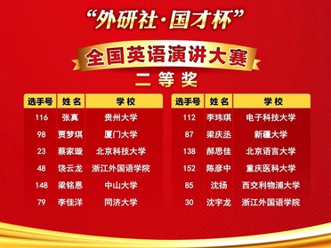 12月3日至12月9日,2021“外研社·国才杯”全国英语演讲、写作、阅读大赛全国决赛在线上举办。此次全国总决赛,我校共斩获英语写作比赛二等奖1项,英语演讲比赛二等奖1项、三等奖1项以及英语阅读比赛二等奖1项、三等奖2项的优异成绩,是历年来参加此次赛事获得二等奖最多的一次,涵盖了全部三个项目,成绩喜人!