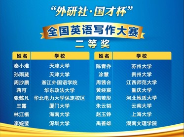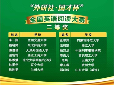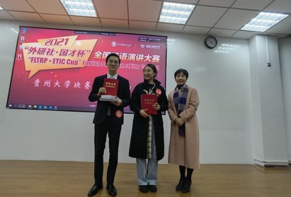 2021“外研社·国才杯”全国英语演讲、写作、阅读大赛自5月正式启动,共吸引全国31省(市、自治区)千余所院校踊跃参赛,超60万学子齐聚赛场。在这三个重要赛事中,新蒲京娱乐场官网3245教师和学生积极参与,担任公共外语教学和专业教学的老师们热心指导学生参赛,共指导2000余名学生参加了学校选拔赛,学生中包括非英语专业及英语专业、日语专业、缅甸语专业的本科生和研究生。历经校级、省级选拔赛后,新蒲京娱乐场官网3245老师指导的学生成绩突出,在相继取得各项赛事的贵州省级复赛特等奖等优异成绩后,又在全国总决赛中与全国其他选手一起鏖战赛场,最终在全国决赛中胜出,三个赛事均榜上有名,取得优异成绩。我校新蒲京娱乐场官网3245老师指导的学生,英语专业本科生涂慧获得英语写作比赛二等奖;英语笔译研究生张真获英语演讲比赛二等奖、日语专业本科生杨芸嘉获三等奖;英语专业本科生章芷璇获英语阅读比赛二等奖、哲学专业本科生索乐琪、工商管理专业本科生黄夏宇获三等奖。